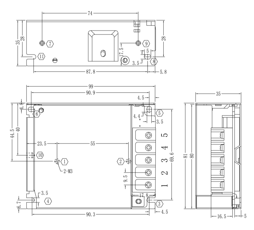 单路开关电源安装尺寸及接线: