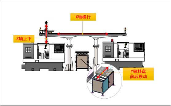 方案采用一拖二的架构,即一个机械手负责两个机床的取放料。对此,taptap,taptap官方网站,taptap登录入口工控提供EC-L3三轴驱控一体控制系统,其中X伺服轴控制机械臂左右横行,Z伺服轴控制机械臂上下运动,Y伺服轴则控制料盘的前后移动。